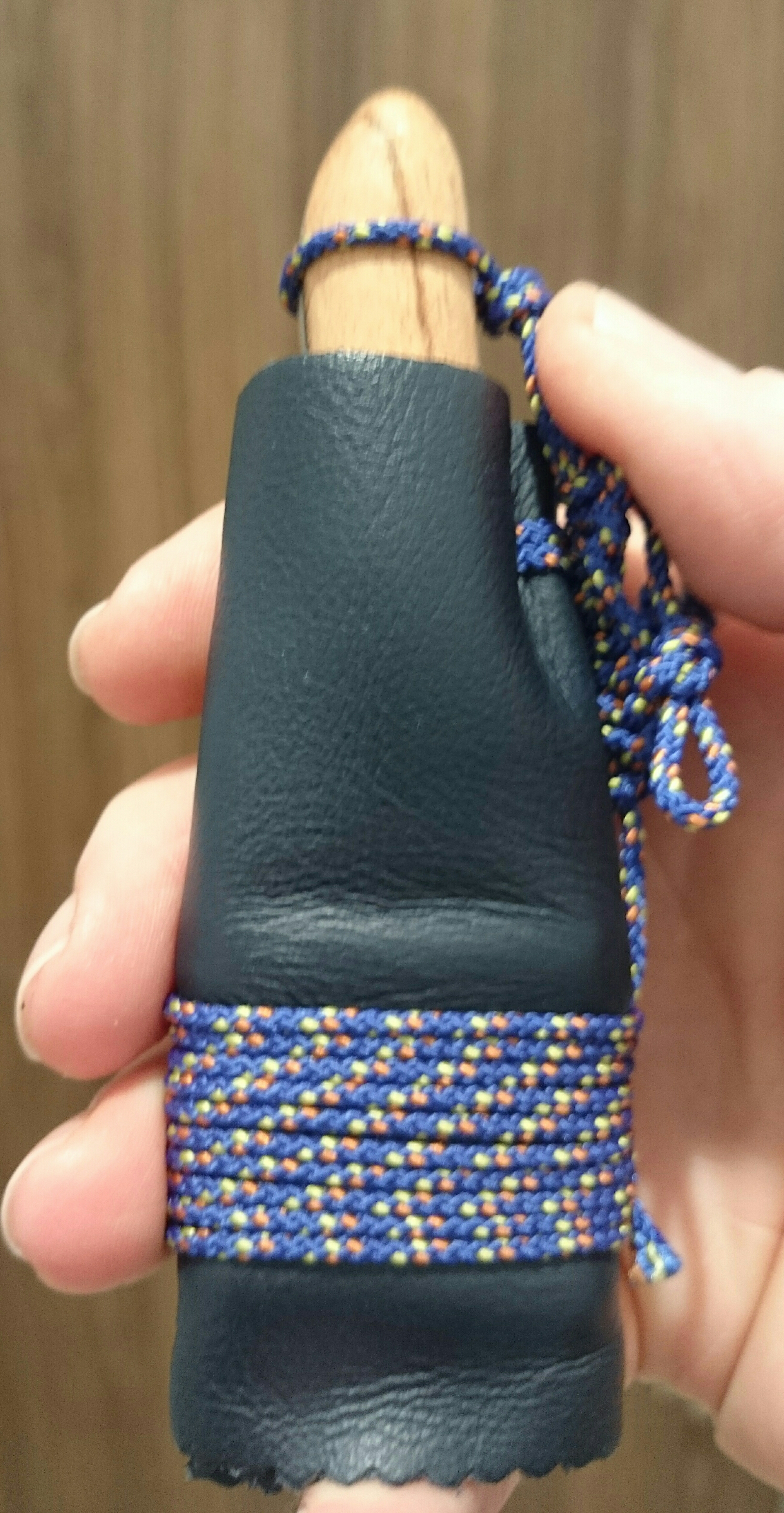 I’ve roughed out a birch bark blade cover that is glued inside the sheath that I’ve further bound with cord. The cord also gives me a retaining loop for the knife. As I don’t currently have the time for stitching and the like the sheath is simply leather wrapped around and glued to the birch bark liner.
