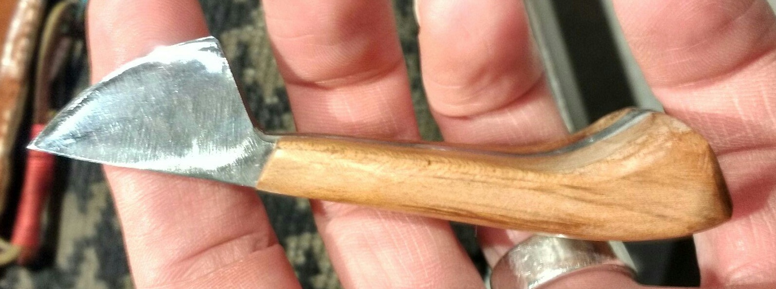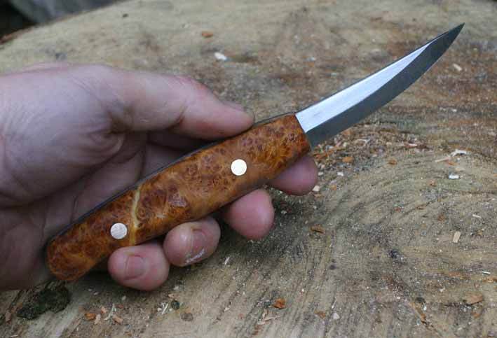 Spooncarving, well, a very different blade preference now. Greenwood is softer and easier to cut but demands sharp tools to get a good finish. Long sweeping, almost planing cuts, very seldom is the tip of the blade even needed for spoons. A long, sweeping blade such as this one,