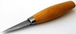 Whittling, a much maligned passtime bringing forth incorrect images of tobaccow chewing old men sitting on rocking chairs wearing dungarees. My own definition of this style, although not referring to who whittles is not overly complimentary and will almost certainly anger some. I tend to think of whittling and spooncarving as very similar but due to the wood used and subjects carved they use very different knives and styles. Whittlings falls into the category of “sketching in wood”. Often coarse in nature and simplistic in terms of design, items that are whittled tend be quick carvings, often full of character and demanding great skill, but somewhat lacking in fine detail. There are a lot of folk out there who paint their whittlings. Lime (basswood, Linden) is the preferred wood for whittling, mainly because it cuts easily and is actually very soft. With a sharp knife a good sized chunk of wood can be rendered down to quite a small figure very quickly. This style of carving is very popular in the US. This kind of carving often involves quite deep cuts and whittlers often use a short, slim wharncliffe style blade. These are two classic whittling knives.