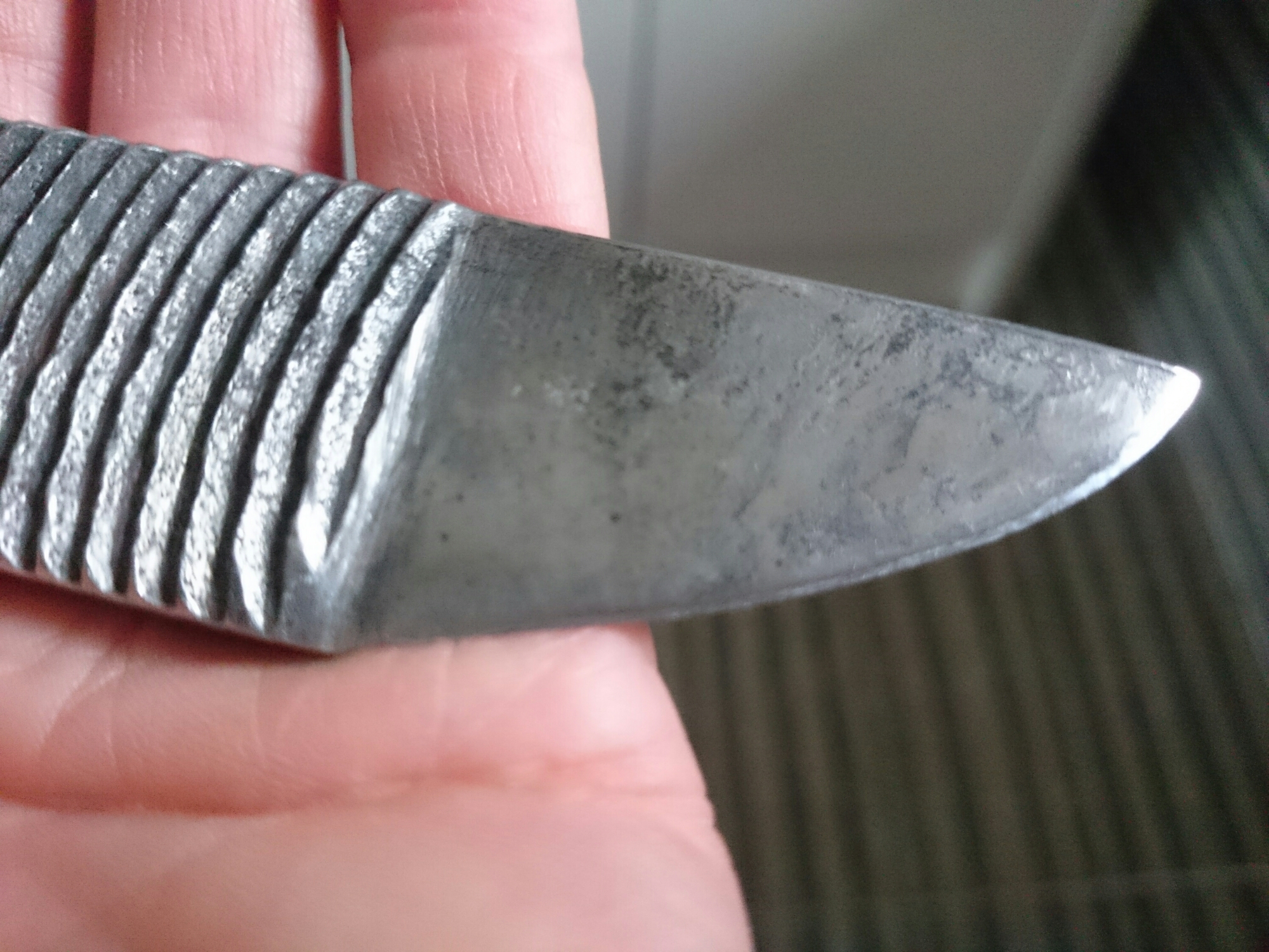 This is my most recent toy. It’s very rough and ready, a really simple shape, which is very very loosely based on a puuko. I’ve done a convex grind and then differentially hardened it.