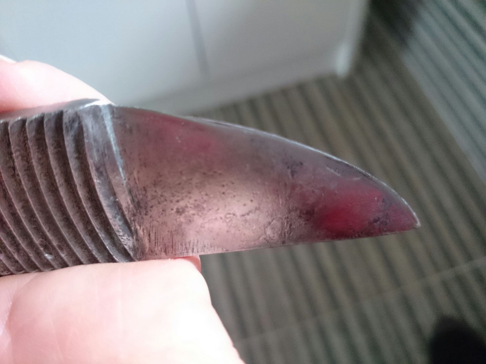 It’s made from a rasp with oddly curved teeth. The handle was treated to a thorough brushing with a wire brush on an angle grinder to give it that, “worn” look and to round off any corners. It has rounded off and dented all the teeth as well as smoothing the sharp edges.