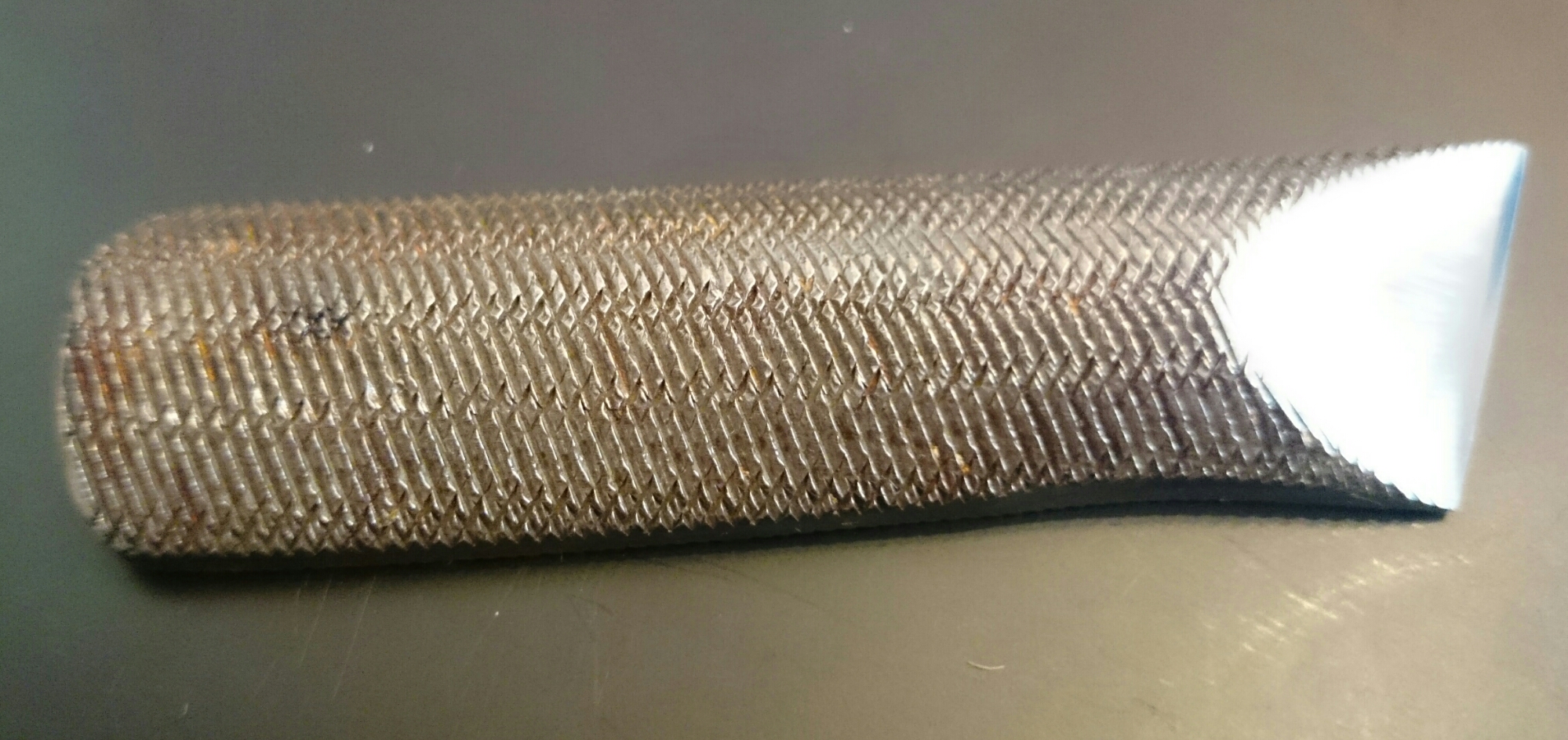 As you might notice it’s ground from a half round file which means it’s really, really thick in the middle. It has a flat chisel grind with a very shallow convex curved secondary bevel and is so sharp I was able to do those awkward little bits of shaving in my beard today.