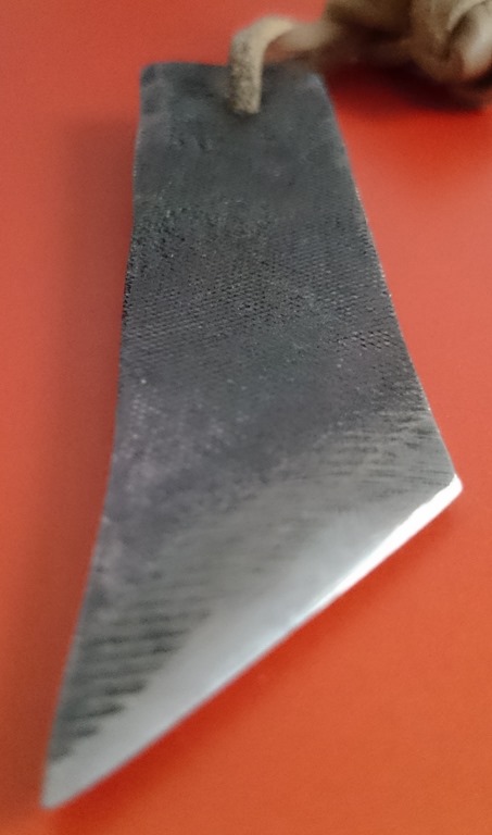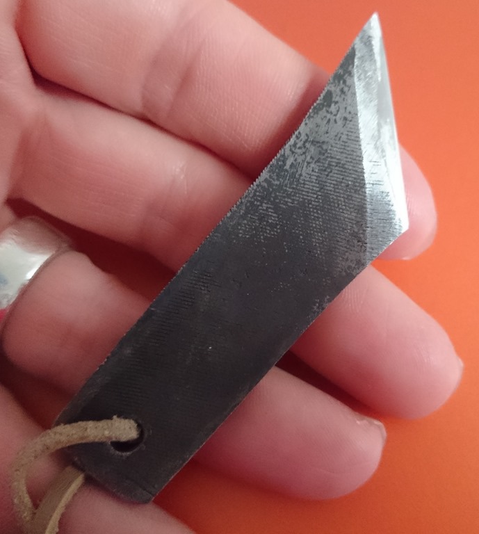 This is my latest, it’s basically just a rough bit of old file that has been heated up, bashed a bit with a hammer and then had an edge ground onto it before being hardened and then honed to a razor edge.
