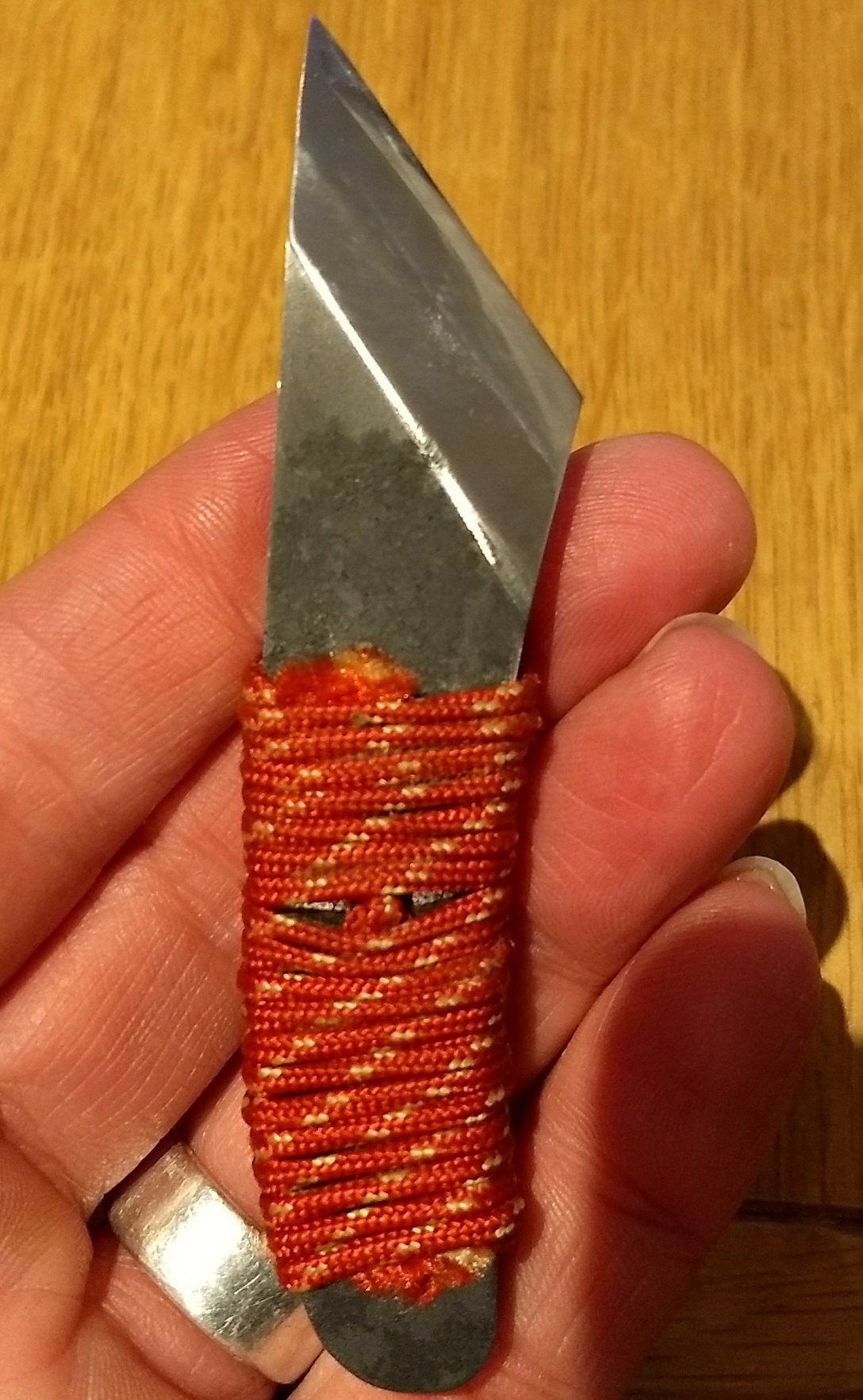 Latest little piece of sharp steel. It’s made from an old wood turning tool and is lovely and thick. Hair splitting sharp and fits just right in my hand and pocket.