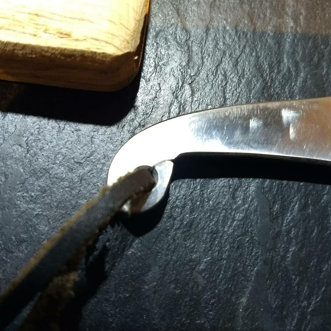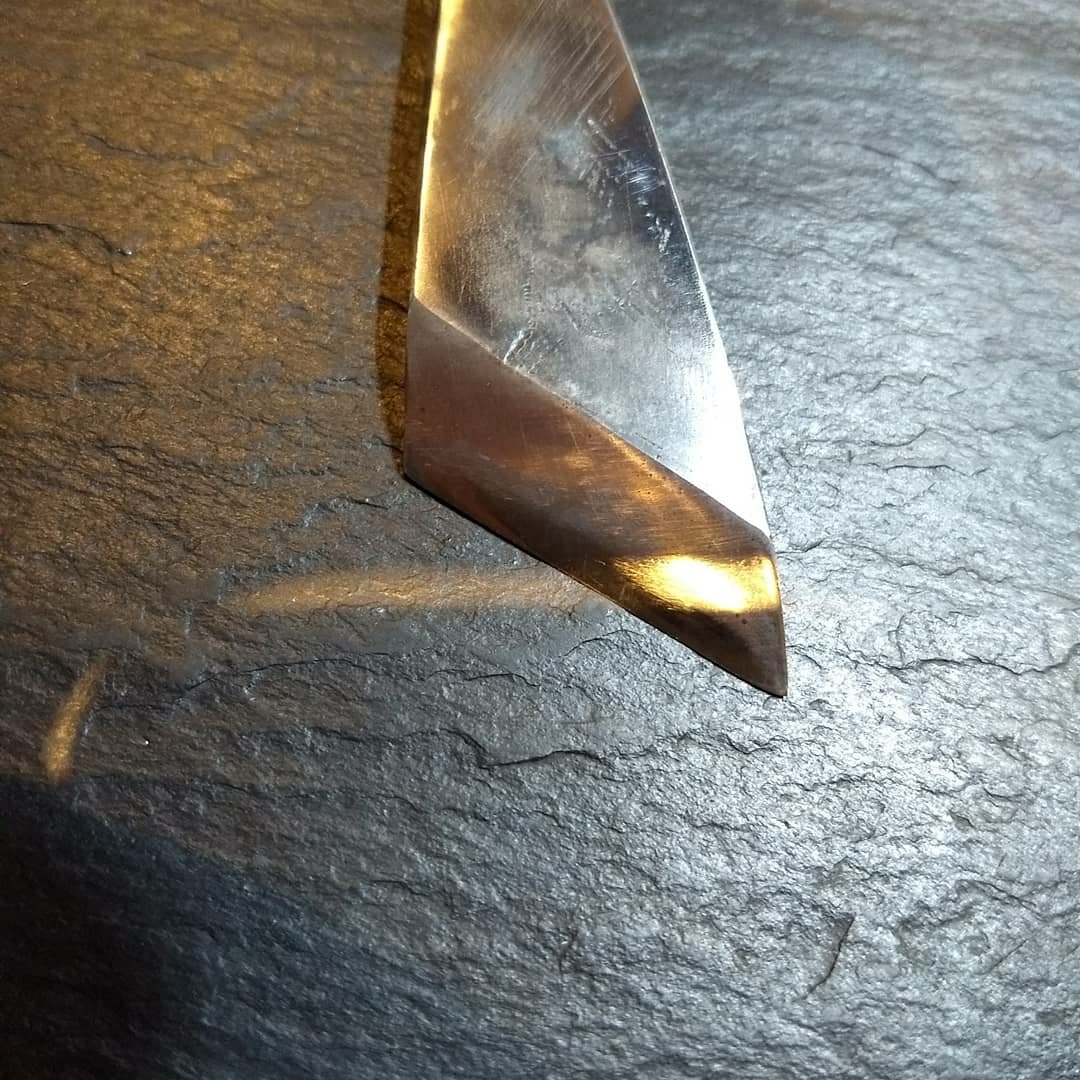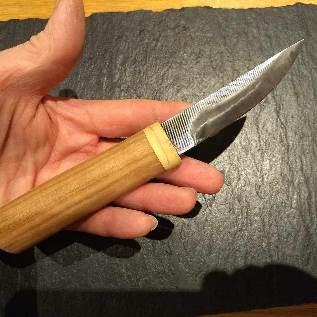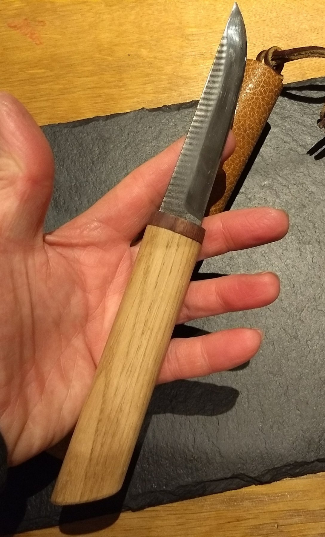 Now, husband is an outdoorsy type so a kiridashi would be wrong. So, puuko style with a pear and boxwood handle. No prizes for guessing what the blade is made of.