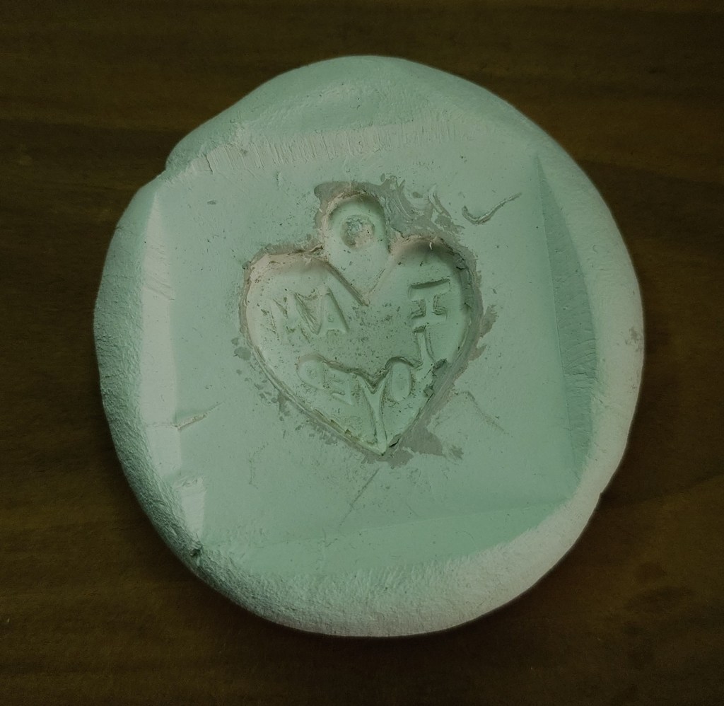 I have toyed with jewellery before and have wanted to make silver items out of silver clay for a while so I set about creating a pendant for her. First I carved the pendant in a piece of Pear wood. Then I took mould from this in air drying clay. Once this was set I pressed some silver clay into the mould before allowing it to dry and then tidying it up before firing it.
