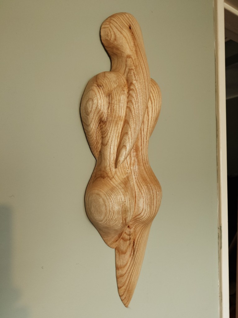 I like nothing better than to try new shapes, new styles and new forms. This is also prevalent in my carving although with my carving there is also a big element of therapy. With my knifemaking I start out with a product in mind and I go full steam ahead to make it. When I carve it is as much the journey as the end result that I find most fulfilling. My most recently finished unique piece, which now hangs on my lounge wall, is a classic case of this. I have spent some months now working on this piece, it is the piece of wood that I like to sit on my knees and take thin slivers of wood from with sharp knives. Often merely the act of using a sharp knife on a piece of wood is enough to make me feel better and I have been particularly stressed during the past few months at work and so have needed that stress relief. In the past 6 months I have completed two sculptural carvings and each one, “Louise” and “Emma” has taken considerably longer to carve than it would had I just been interested in the end result. No it was the carving I enjoyed and gained fulfilment from, yes I enjoyed the creativity and the end results have both been exactly what I originally envisaged but the end result wasn’t the driving force.