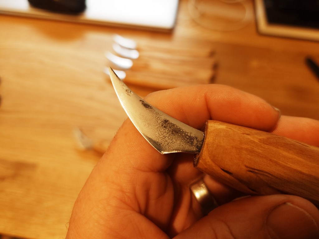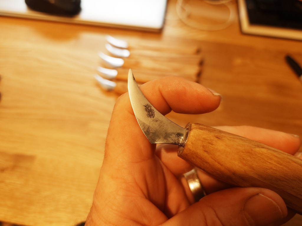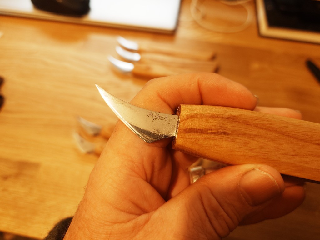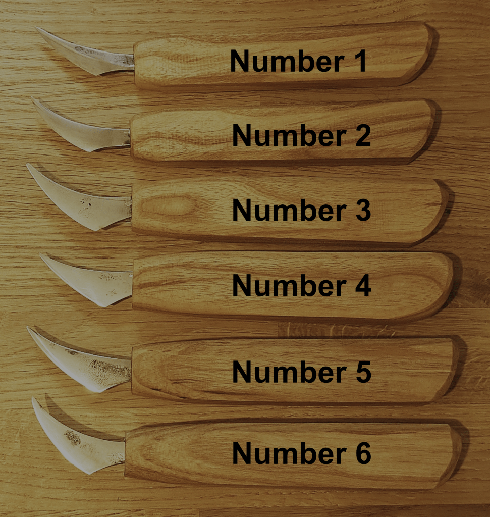 I have developed this style of blade for both general carving and detail work. They are hand forged from O1 carbon steel and have a shallow convex grind. The blades are mounted in simple Ash handles which can be further shaped to suit the user.