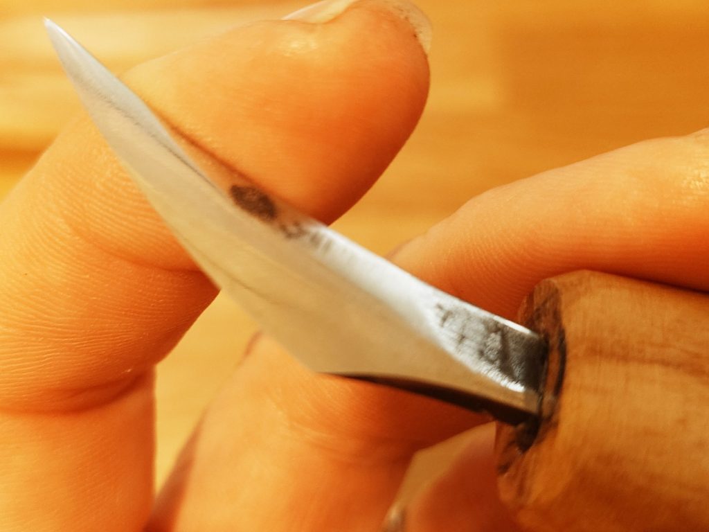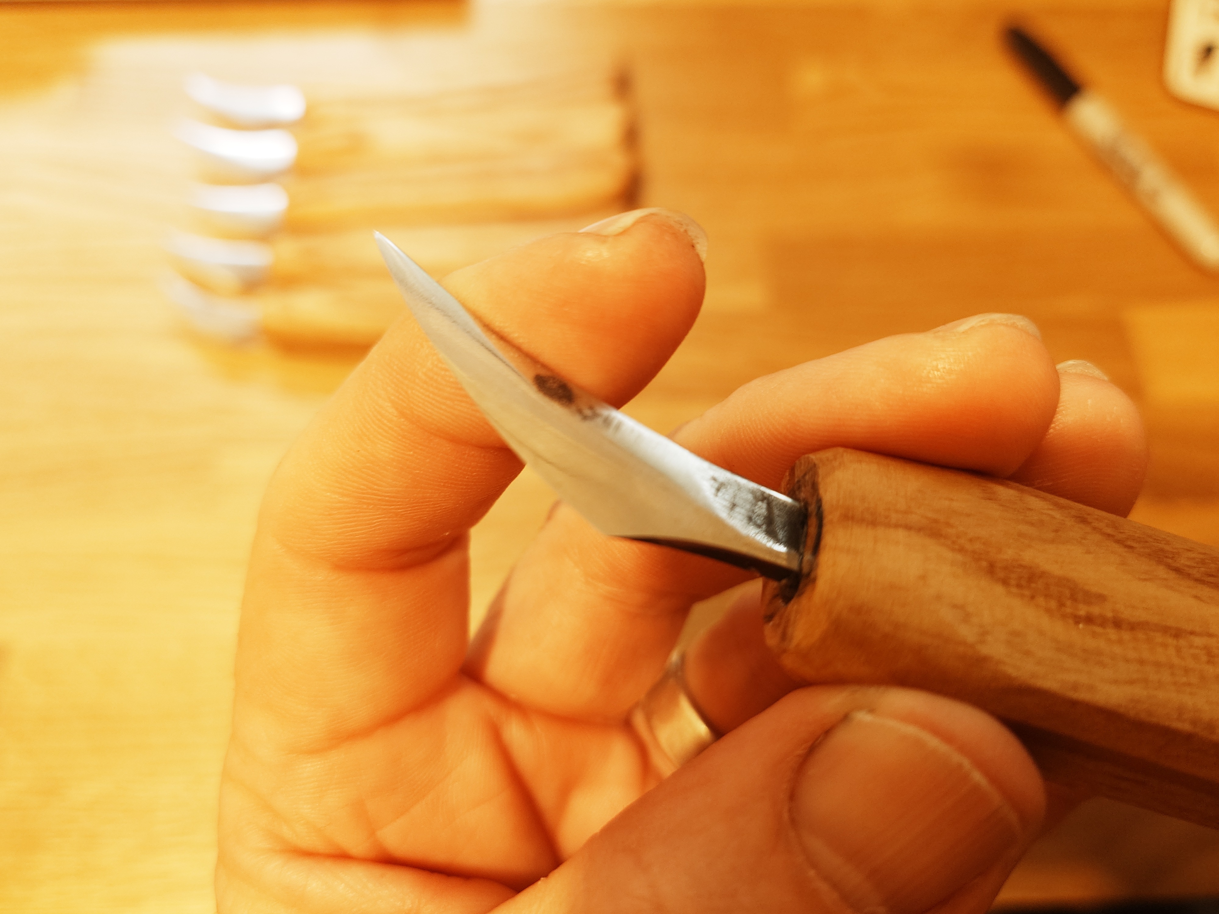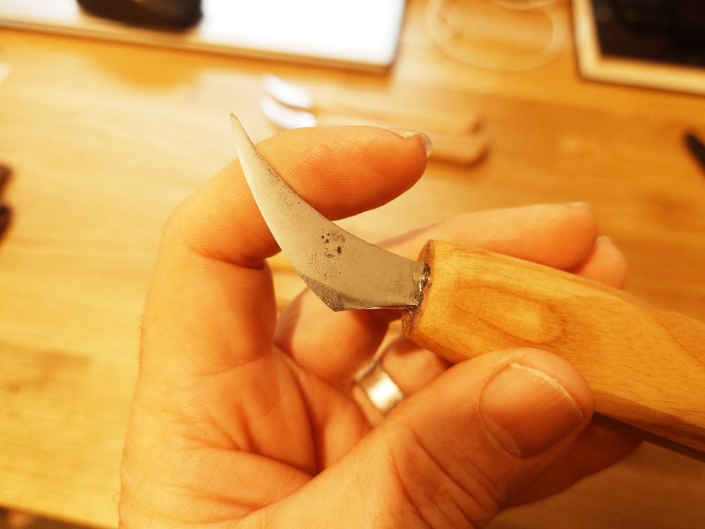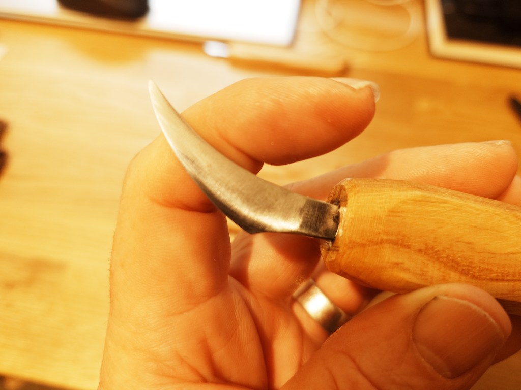 I have developed this style of blade for both general carving and detail work. They are hand forged from O1 carbon steel and have a shallow convex grind. The blades are mounted in simple Ash handles which can be further shaped to suit the user.